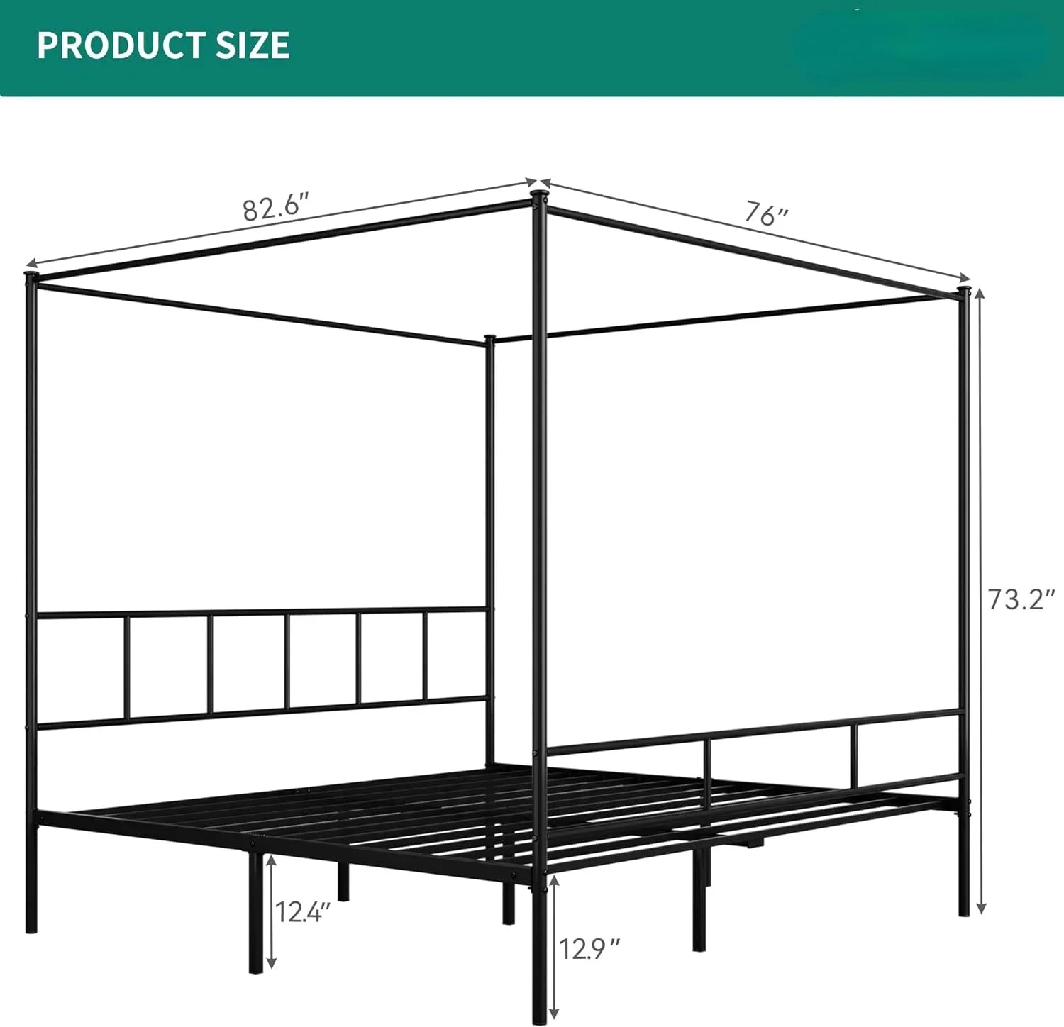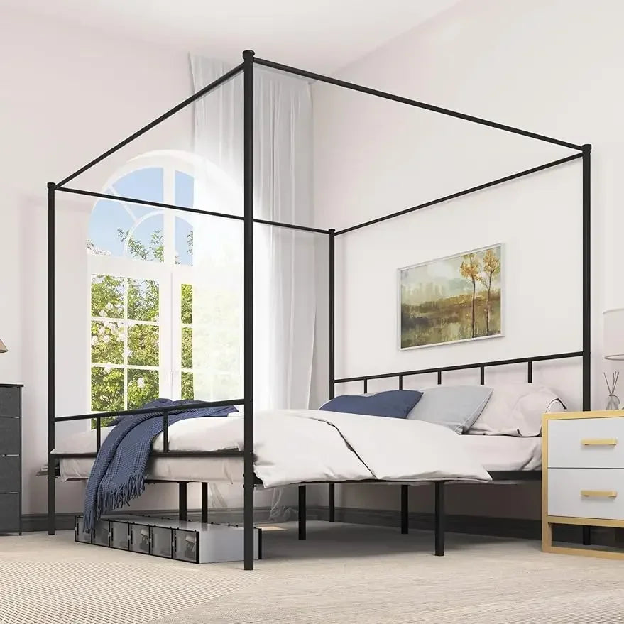 King Size Bed Frame, Metal Canopy Four Poster Bed Frame with Built-in Headboard Strong Metal Slat Mattress Support, No Box Spring Needed, Black