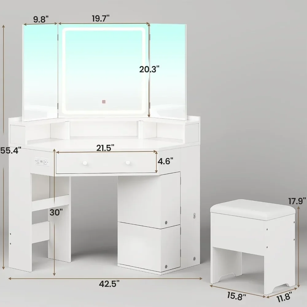 【Modern, Space-Saving Corner Vanity Design】 Fits seamlessly into any corner, making it perfect for small spaces. As a storage master, this vanity set includes a storage bench which allows you to stash some odds and ends.